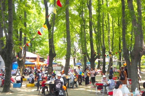 現在は屋外の“ひらたの杜”と、隣接する体育館を会場に開催されています。“ひらたの杜”は木々が茂る緑豊かな空間で、歩くだけでも気持ちよく、木陰で休んだりお茶を楽しんだりと、思い思いに過ごすことができます。こうした開かれた雰囲気もあり、地域の方がたから好評を得ています。