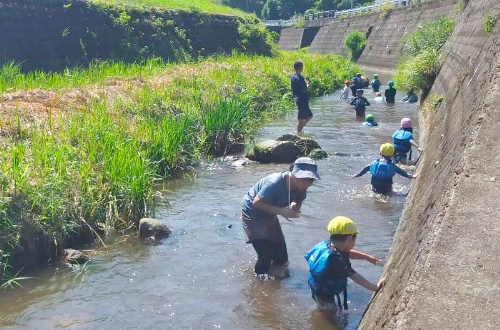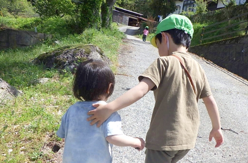 園児たちは毎日散歩に出かけ、近隣住宅の庭で遊んだり、川遊びをしたり、野山を駆け回ったりします。日々開催される「お散歩会議」では、子どもたちが自ら行き先を決めます。